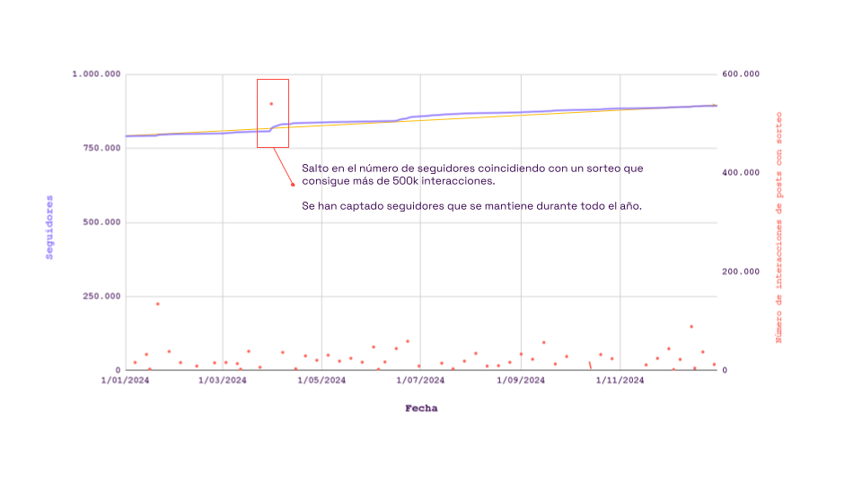 Relaciona los cambios de métricas con acciones específicas (sorteos, lanzamientos, cambios en la frecuencia de publicación) y evalúa su impacto a lo largo del tiempo.