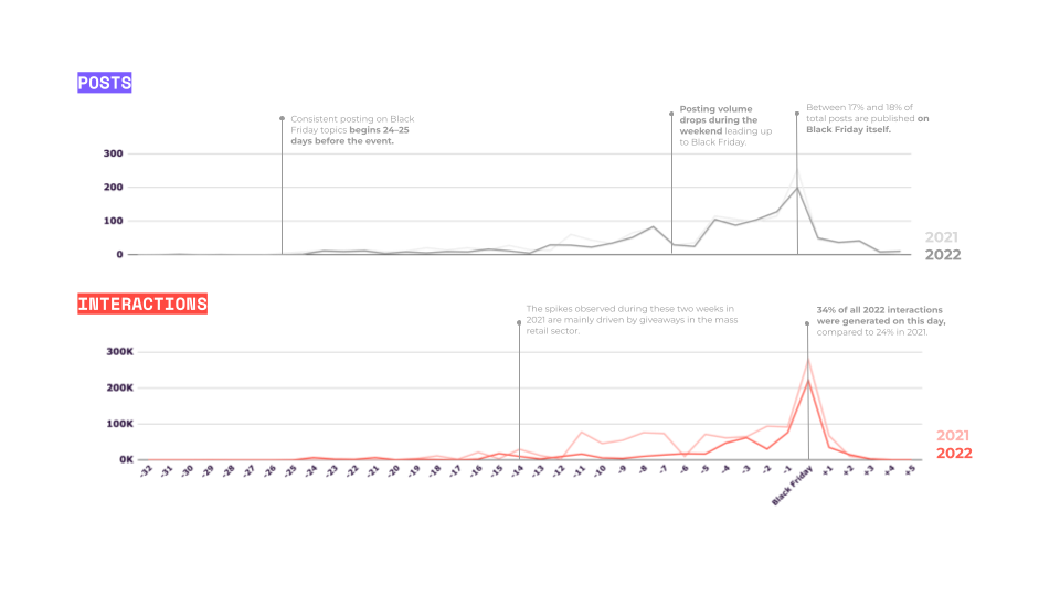 In a two-year Black Friday analysis, we saw that brands consistently started posting about Black Friday about three weeks in advance.